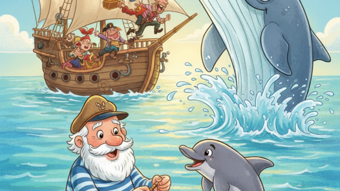 Opa Jörg pfiff schrill durch seine rote Trillerpfeife. „Das reicht, Freunde!“ Der Delfin hörte auf und Finn stoppte sein Schubsen. Gemeinsam, der alte Mann auf dem Rücken des Wals und der befreite Delfin an ihrer Seite, verließen sie die Bucht. Sie hinterließen die Piraten, die damit beschäftigt waren, ihre Würde – und ihr Frühstück – wiederzufinden.