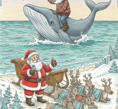 Finn antwortete mit einem sanften, singenden Ton, wie Wale es tun. Gemeinsam folgten sie den Geräuschen und fanden in einer kleinen, versteckten Bucht den Weihnachtsmann! Sein großer, voller Sack lag neben ihm im Schnee, und er wischte sich eine Träne aus dem Auge.