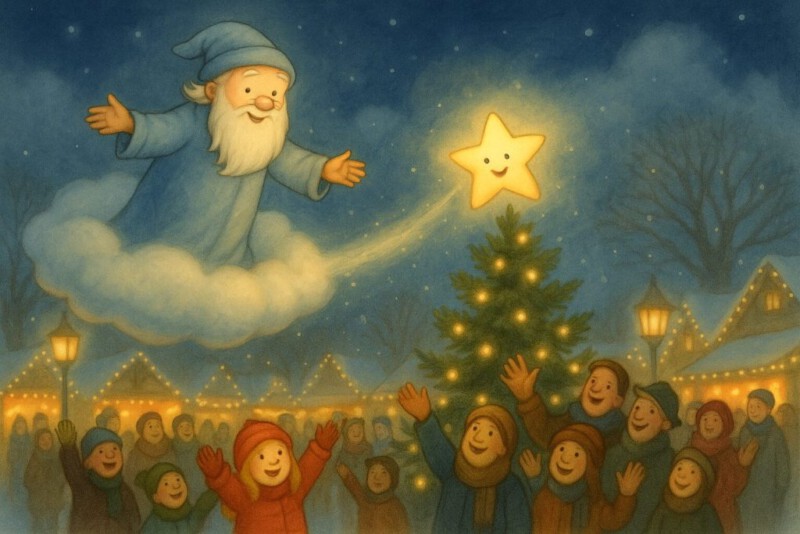 Da! Gleich hatte er die Erde erreicht. Aufgeregt breitete er seine Zacken noch ein wenig weiter aus, und blieb am höchsten Zipfel der großen Weihnachtsmarkttanne hängen.
